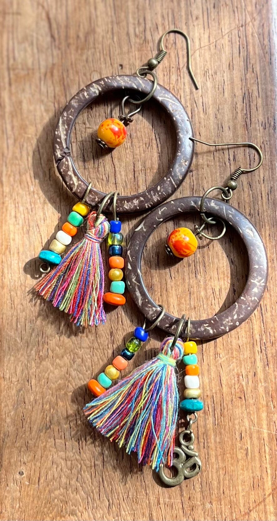 Créoles bronze,coco très légères,perles de rocaille,pompon multicolore,breloque "OM".