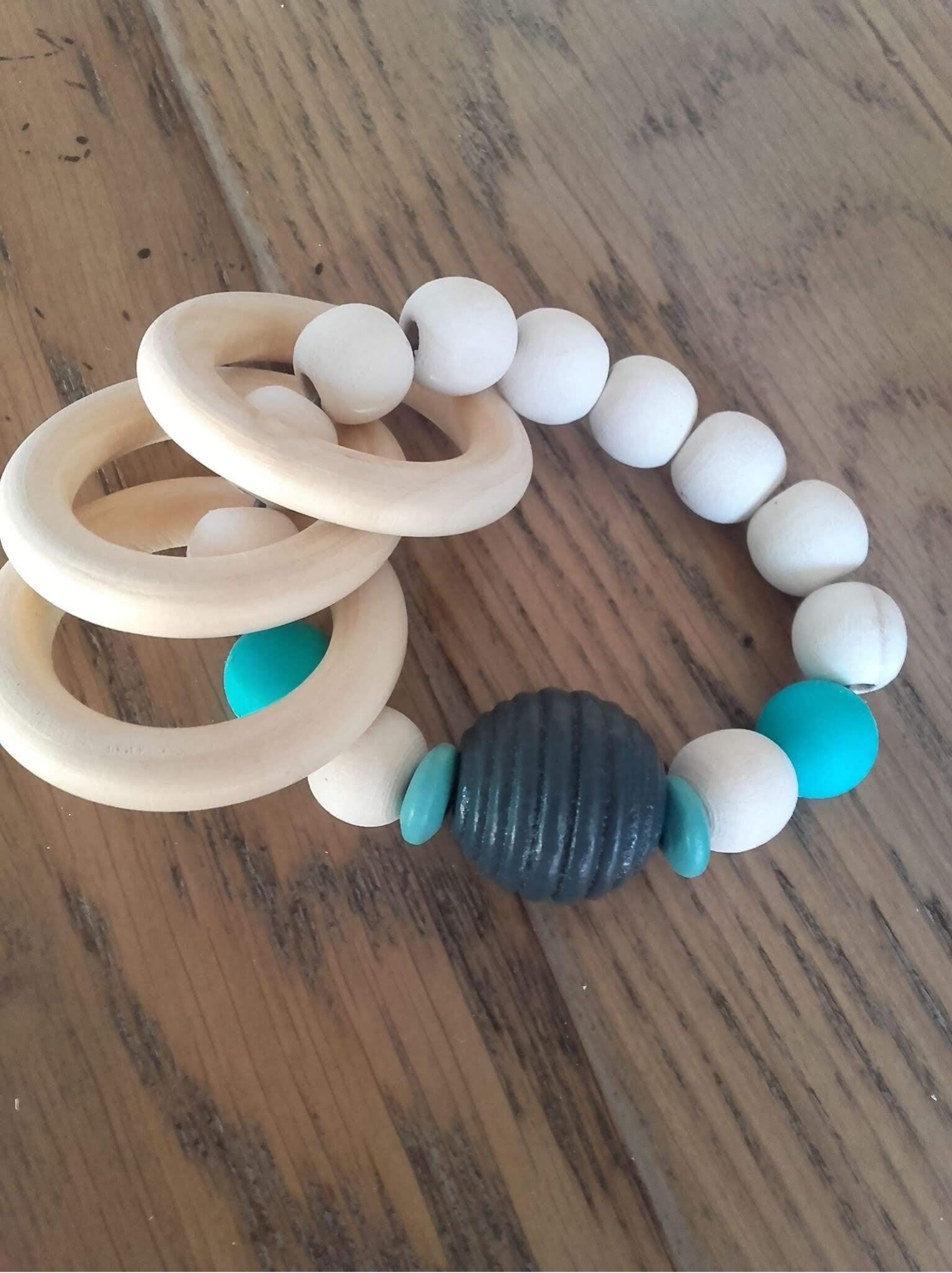 Hochet perles et anneaux bois naturel et silicone.