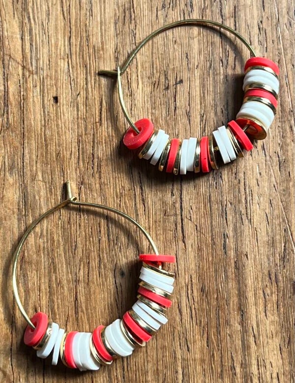 Créoles métal doré,perles Heishi en rouge et blanc (tradition du sud ouest oblige)!