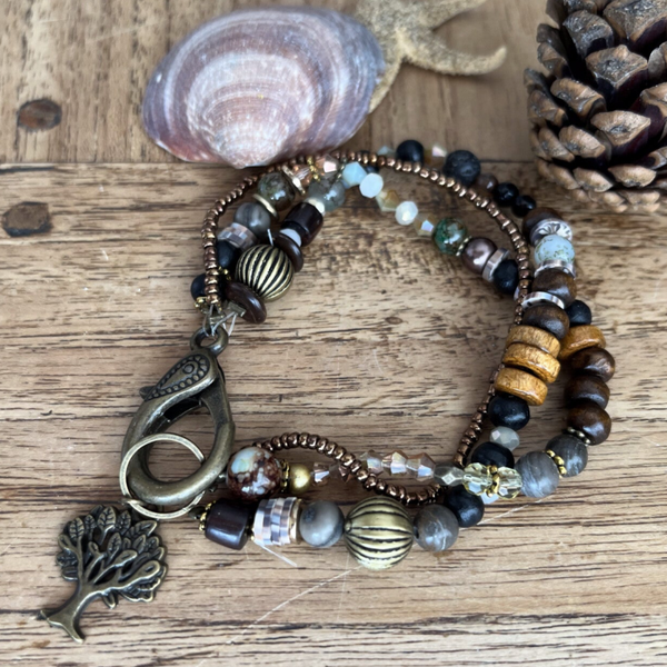 Bracelet 3 rangs perles bois, rocaille, pierre façonnée et métal bronze, attache mousqueton et breloque arbre de vie.