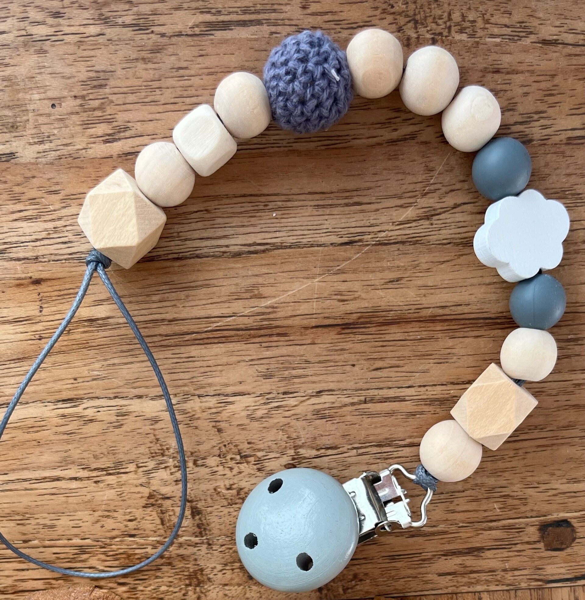 Attache sucette perles bois naturel et gris, petit nuage blanc, clip bois gris.