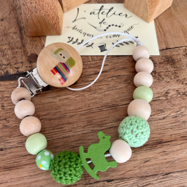 Attache sucette perles en bois naturel et vert, perles crochet, clip en bois éléphant.