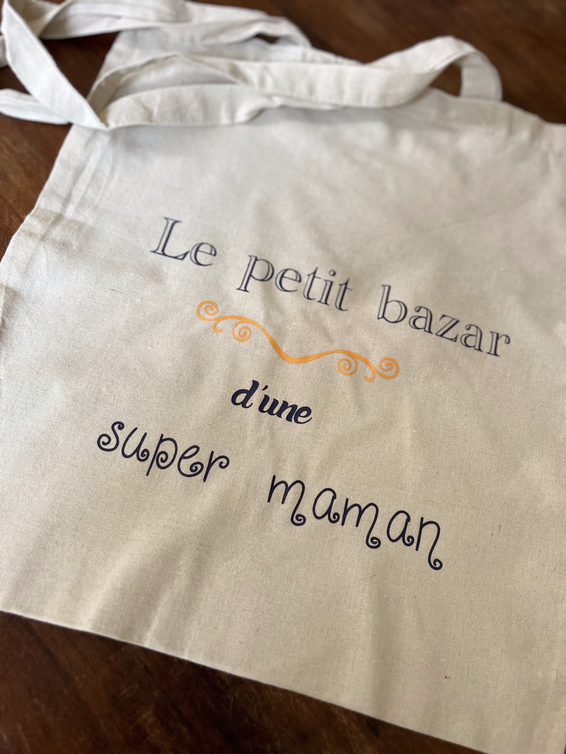 Sac coton beige, flocage bleu marine et arabesque orange.