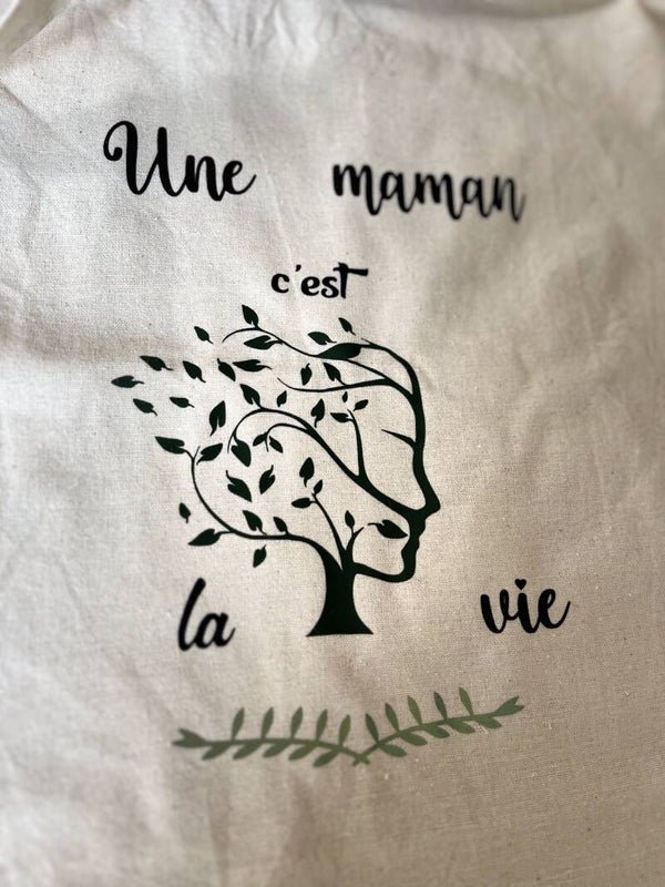 Sac coton beige flocage noir et arbre de vie vert bouteille, petite arabesque feuille vert hollographique.