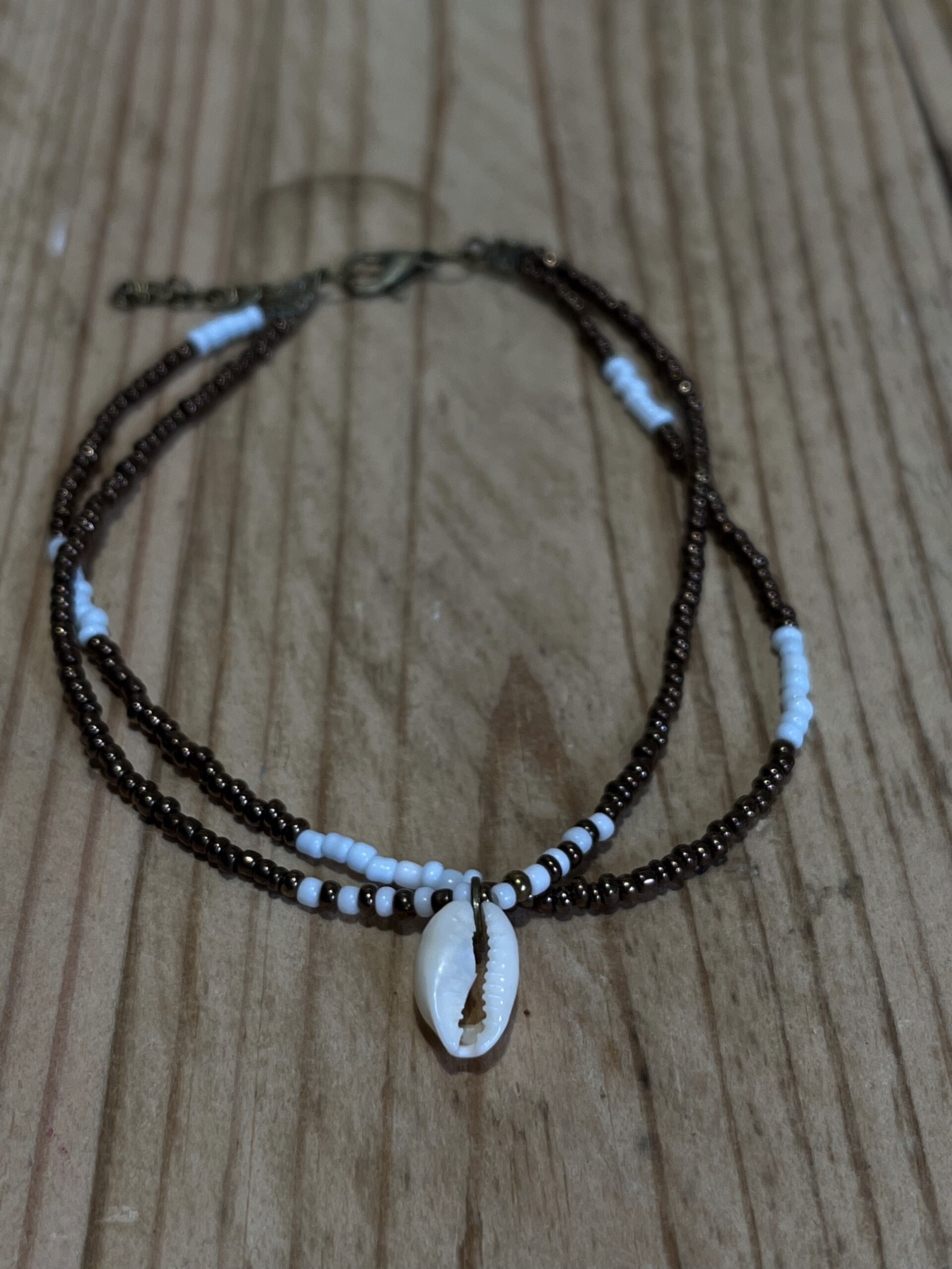 Bracelet de cheville double en perle de rocaille et charm coquillage porcelaine.
