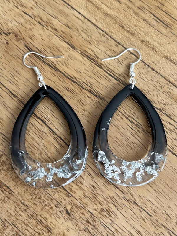 Boucles d'oreilles en résine teintée noire et feuilles d'argent.