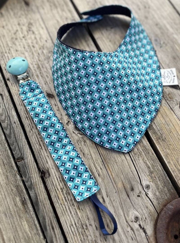 Bavoir bandana arrondi, doublé nid d'abeille bleu marine, réversible.