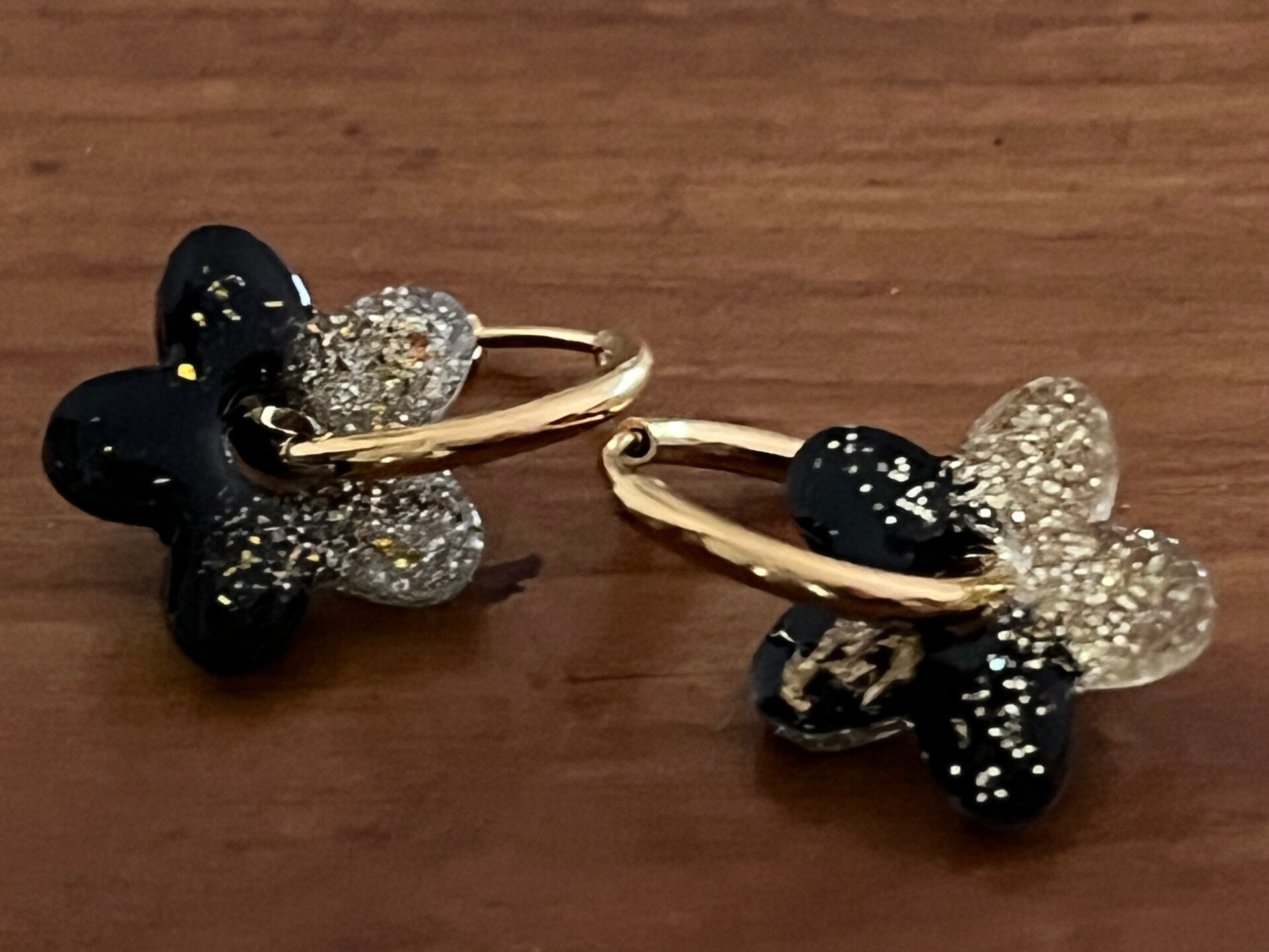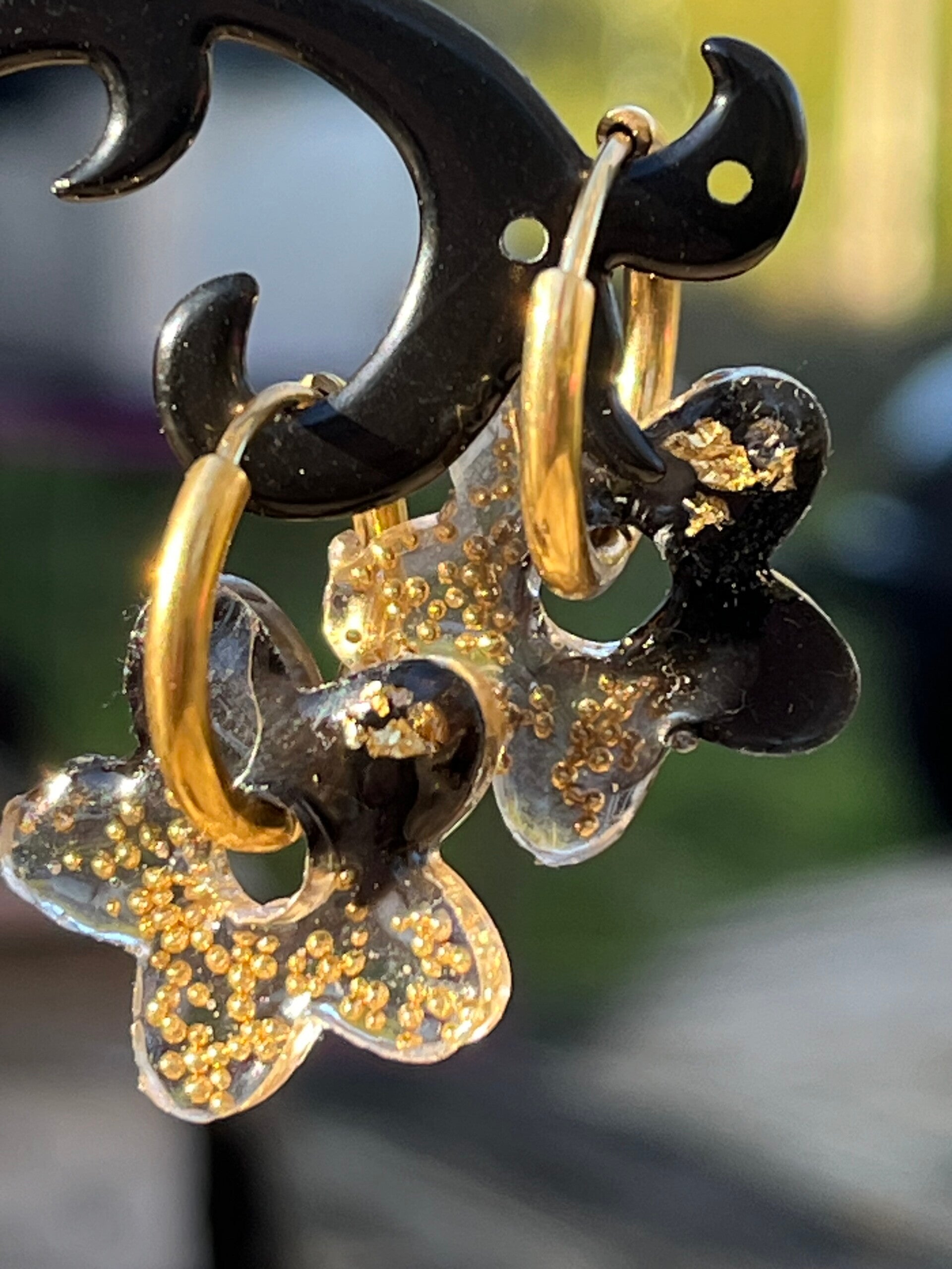 Créoles 14mm dorées, fleurs noires et or en résine époxy.