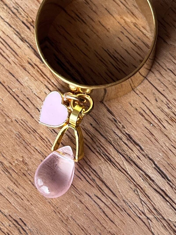 Bague ajustable en acier doré, charms goutte rose clair et petit coeur en émail rose clair.