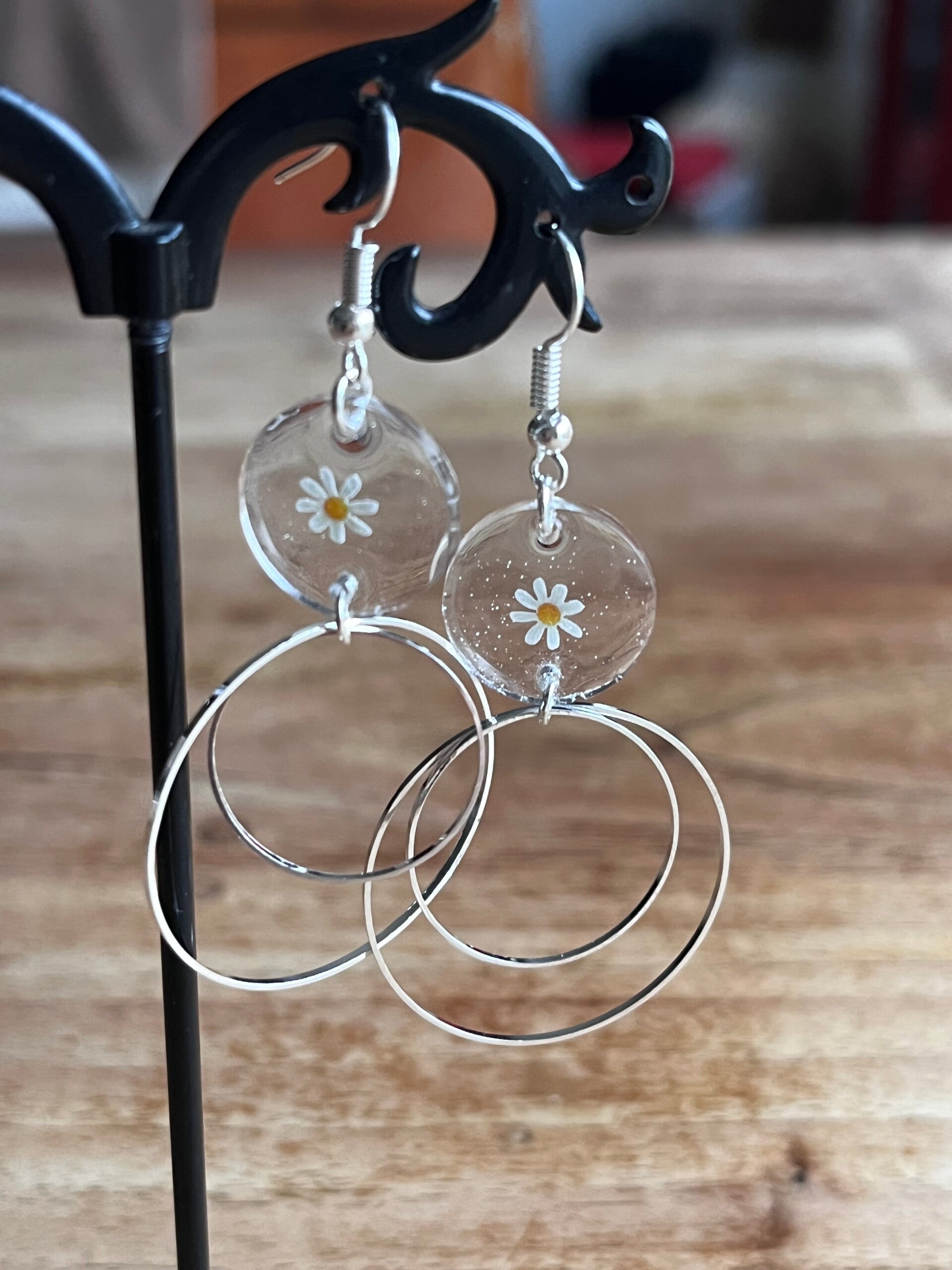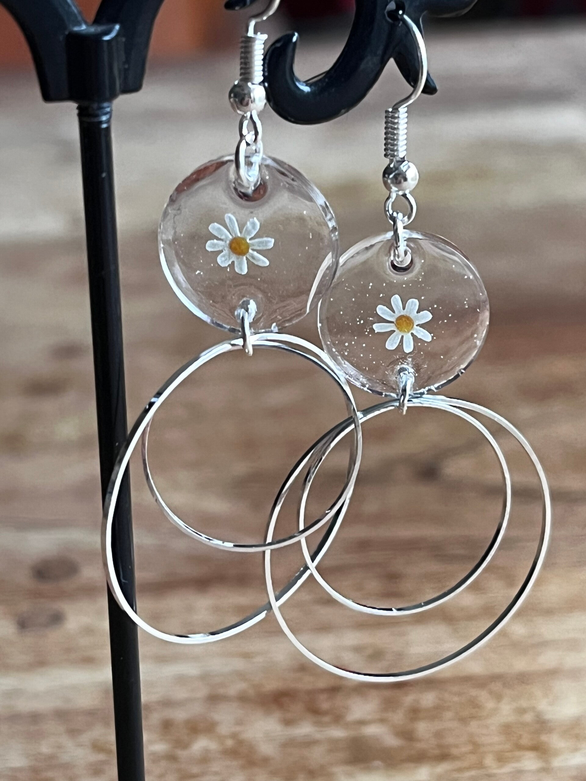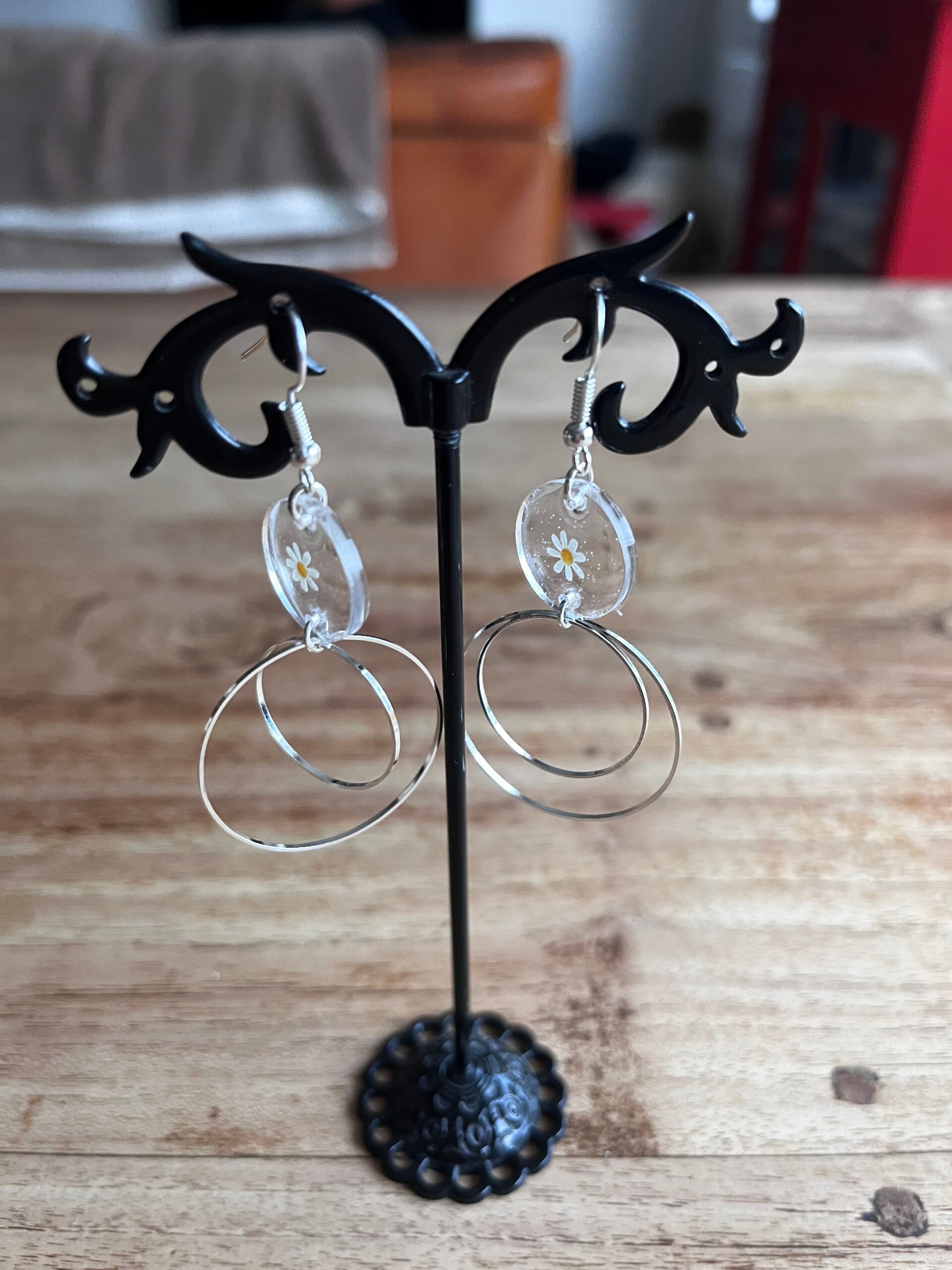 Boucles d'oreilles pendantes en acier inoxydable argenté, deux anneaux suspendus à un charm en résine.