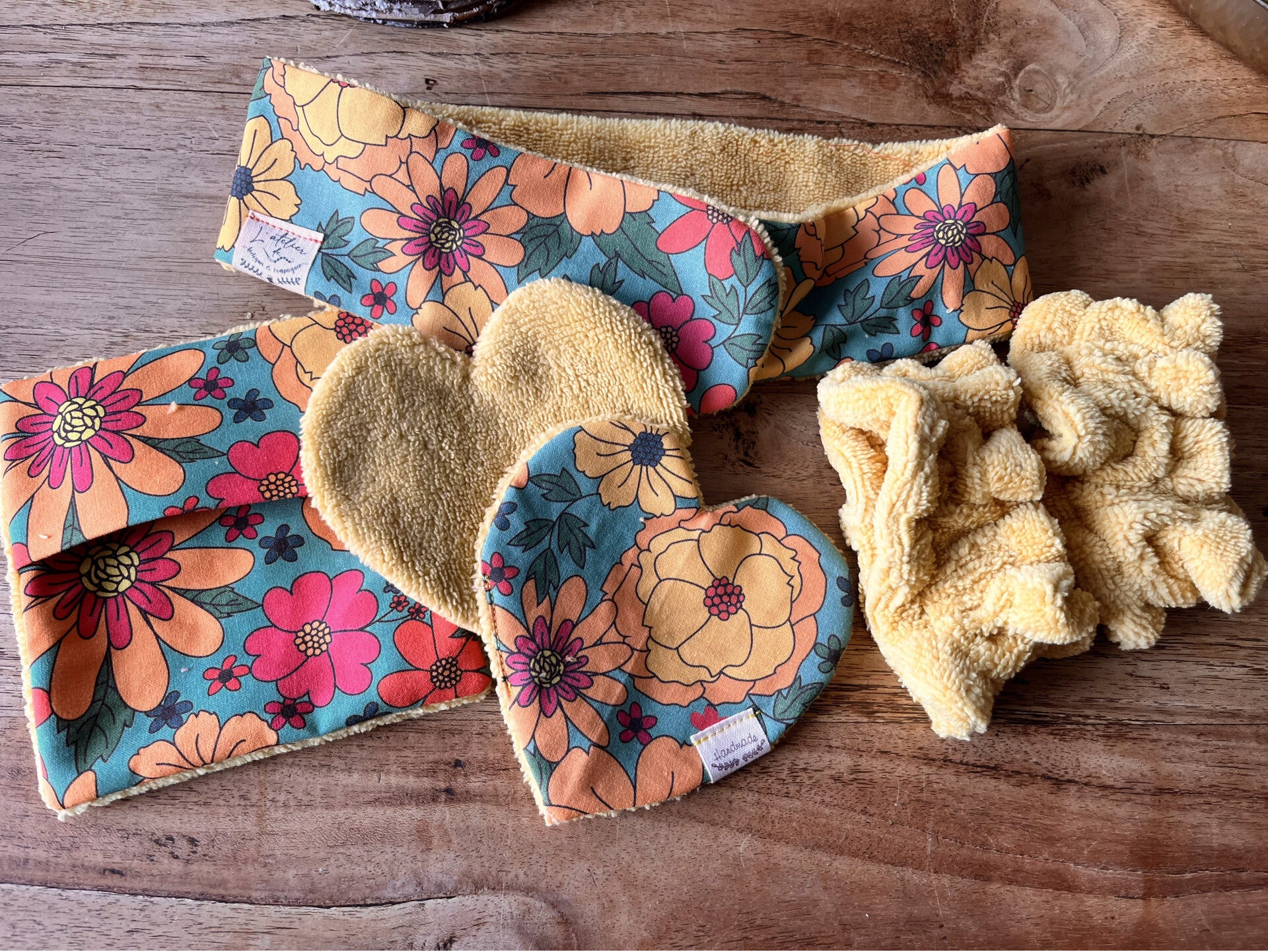 1 bandeau doublé en bambou EKOTEX, 1 débarbouilette, 2 lingettes lavables en forme de coeur et 2 bracelets anti coulure dans les manches !