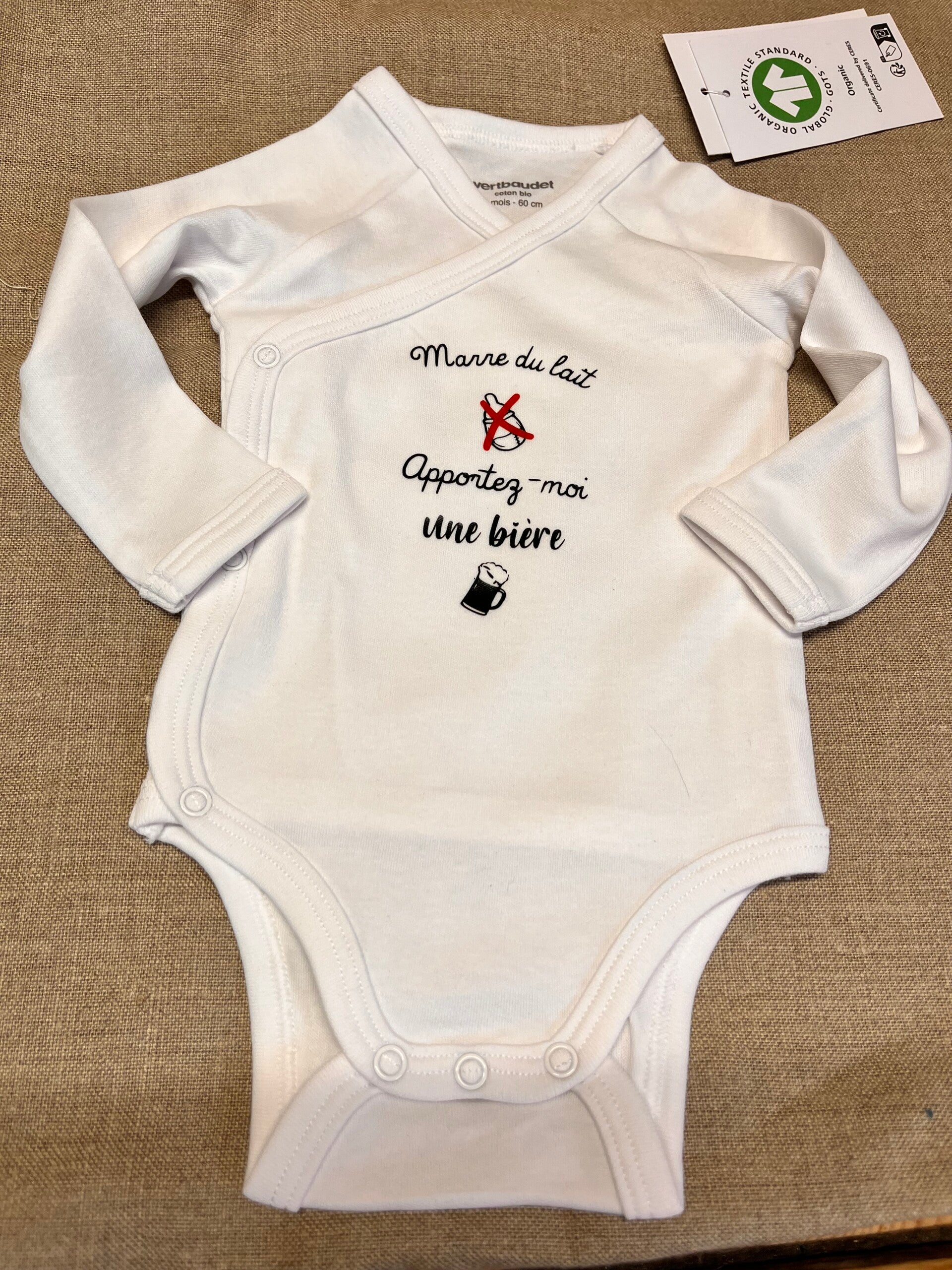 Chaque body est orné d'un petit mot tendre, humoristique, un prénom, une date, une annonce à faire (veux-tu épouser ma maman, je vais être grand frère ...), floqué à la main selon vos envies pour un cadeau unique et plein de sens !