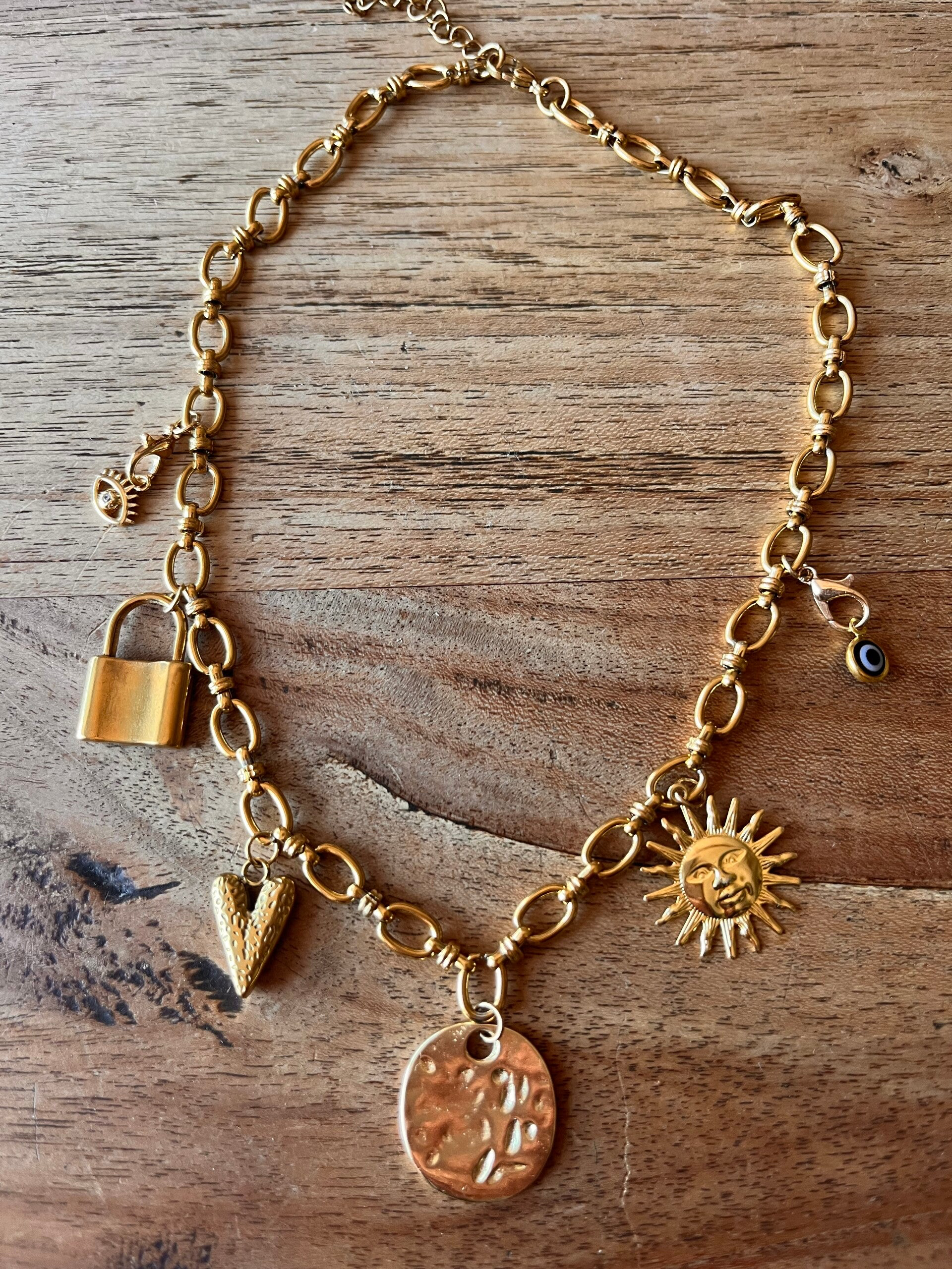 Collier en acier inoxydable ras de cou avec ses 5 breloques interchangeables grâce à leur mousqueton.Dimension approximative 40cm